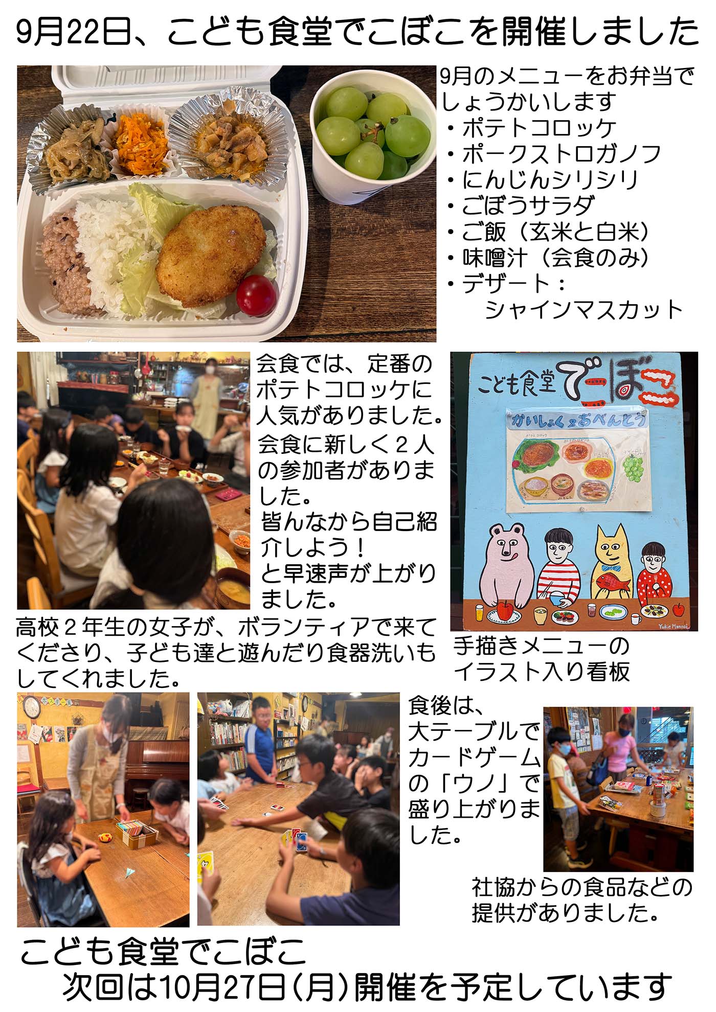 | 9月30日(月) 第5回こども食堂でこぼこのメニューは、 ・魚の竜田揚げ野菜あんかけ ・かぼちゃとさつま芋のマッシュサラダ ・新鮮野菜の甘酢漬け ・トマト入りかきたま汁 ・フレッシュフルーツ |