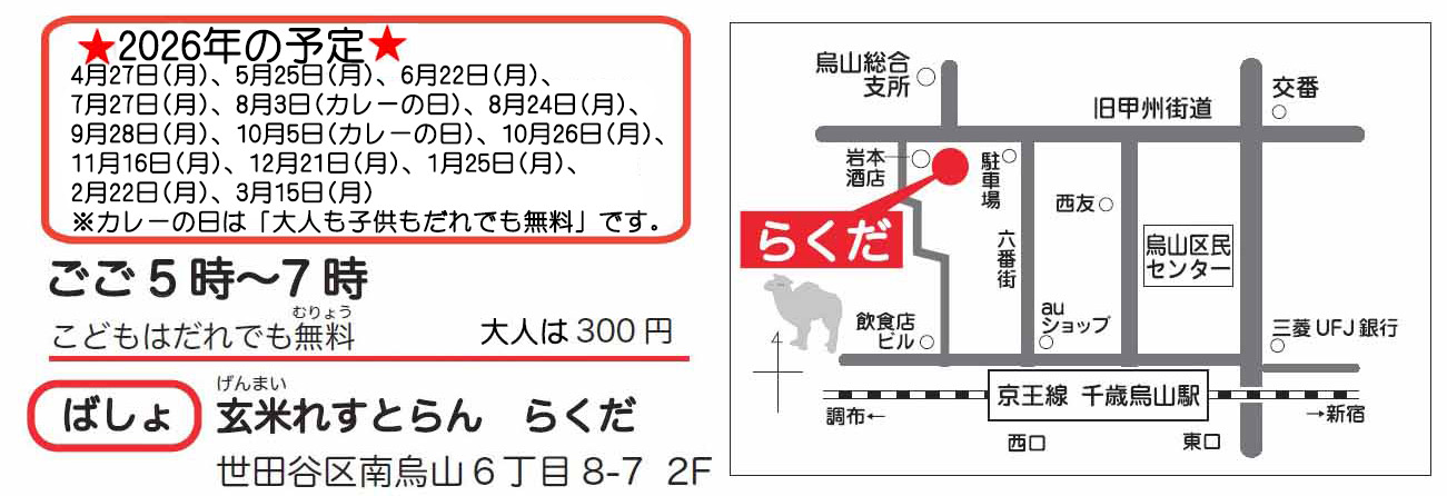 | 電 話 | ●玄米れすとらん・らくだ 火~金 9:00~16:00 03-5313-8151 ●烏山地域社会福祉協議会事務所 除土日祝 8:30~17:15 03-5314-1891 |